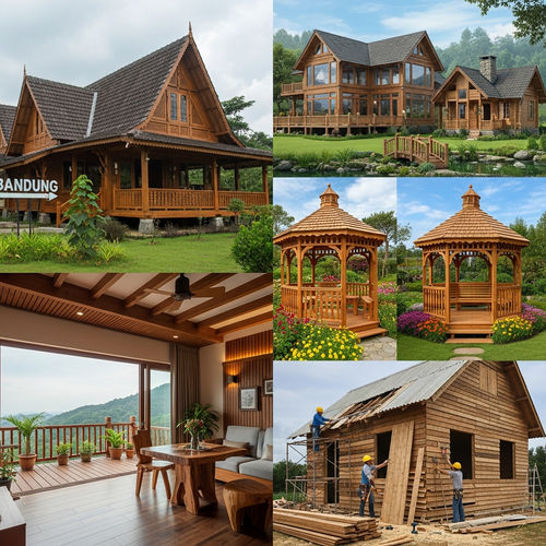 Jasa Pembuatan Rumah Kayu Bandung untuk hunian, villa, dan cottage dengan sistem knock-down (bongkar pasang). Dikerjakan oleh tim berpengalaman lebih dari 13 tahun, material kayu kering oven, pemasangan cepat, dan desain custom sesuai kebutuhan lokasi.
